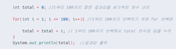 - for문을 이용하여 1부터 100까지의 합을 구하는 프로그램