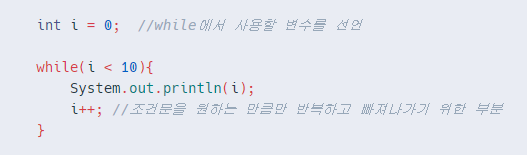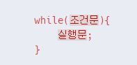 - 조건문의 실행 결과가 true일 동안 반복해서 실행한다.