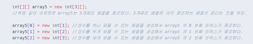 - array4[1] 은 또 다른 1차원 배열을 가리킬 수 있는 참조형 변수이기 때문에 값을 담을수는 없다.