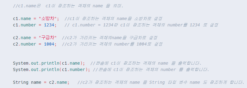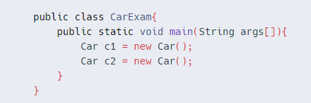 - 위의 코드가 실행되면 Car라는 객체가 2개가 만들어지고 각각의 객체를 참조하는 c1과 c2변수가 선언됩니다.