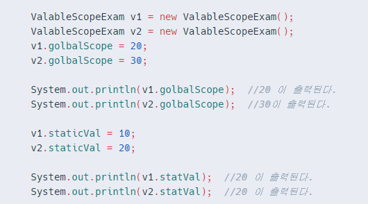 - VariableScopeExam.staticVal // 근데 이렇게 잘안씀