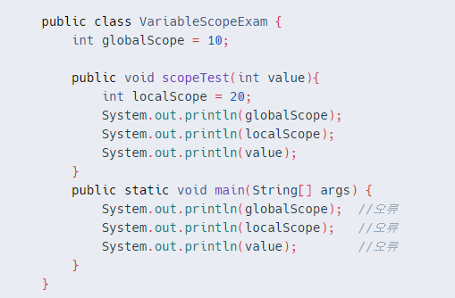 - 메소드 블럭내에서 선언된 localScope 변수의 사용범위는 메소드 블럭내이다.
