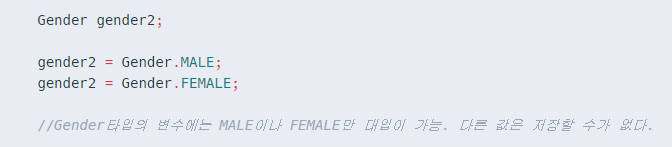- String으로 선언된 gender1 에는 MALE,FEMALE 둘 중 한가지 값을 갖기 원하는데, gender1의 type이 String 이기 때문에 gender1 = "소년"; 이렇게 수행 되어도 전혀 문제가 되지 않는다.