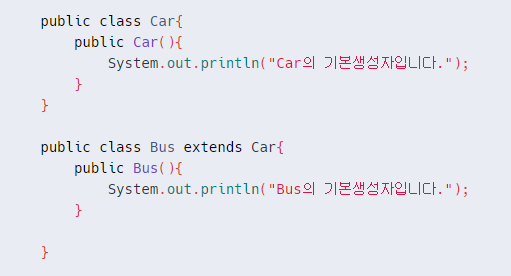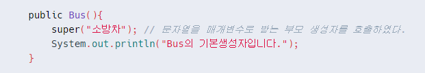 - new 연산자로 Bus객체를 생성하면, Bus객체가 메모리에 올라갈때 부모인 Car도 함께 메모리에 올라간다.