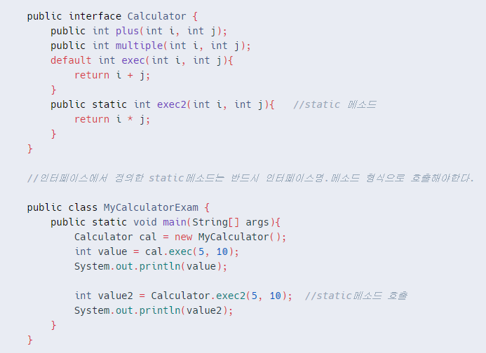 - 인터페이스가 default키워드로 선언되면 메소드가 구현될 수 있다. 또한 이를 구현하는 클래스는 default메소드를 오버라이딩 할 수 있다.