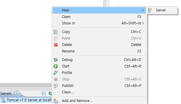 4) Servers 탭에서 마우스 오른쪽 버튼 클릭 후 New -> Server 선택